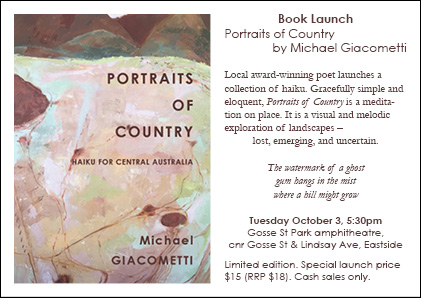 Book Launch – Portraits of Country: haiku for central Australia ml4gia / September 19, 2017 When: Tuesday October 3, 5:30pm Where: Gosse St Park amphitheatre (below Spencer Hill), corner Gosse St and Lindsay Ave, Eastside Share this: Click to share on X (Opens in new window) X Click to share on Facebook (Opens in new window) Facebook Like Loading...
